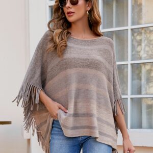 Striped Boat Neck Poncho with Fringes
