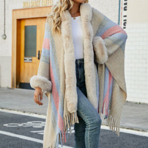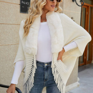 Faux Fur Trim Fringed Poncho