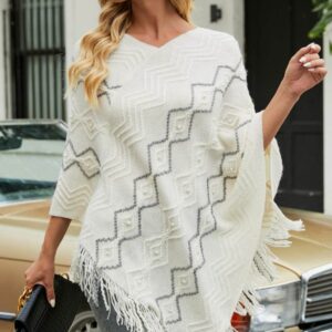 Pearl Trim V-Neck Fringe Hem Poncho